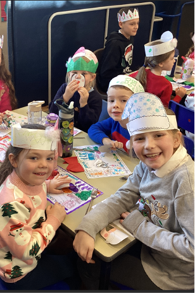 Year 5 and Year 6 children did a fantastic job looking after younger children, cutting up food, helping them pull crackers and reading out jokes. Whether it was a Christmas dinner or a Christmas-themed packed lunch, everyone was able to eat together and enjoy sharing the celebration.
