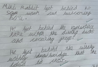 This has helped children produce some lovely writing such as Jessie’s (Y3) descriptions of Mini Rabbit from ‘Not Lost’;